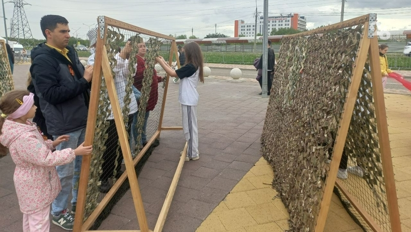 На Владимирской площади ставропольцы плетут маскировочные сети и изготавливают предметы походного быта: стельки, сушильные мешочки для обуви, подушки, окопные свечи. Волонтёры также создают копии Знамени Победы, украшают Георгиевские ленты.