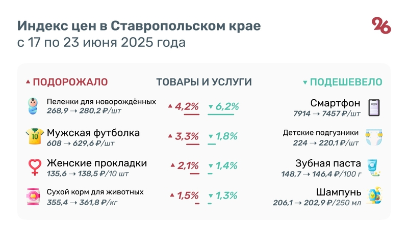 Смартфоны подешевели на 6,2% — 7914 — 7457 руб. В пределах 2% стали дешевле детские подгузники, зубная паста и шампунь. Подробнее — в инфографике «Победы26».
