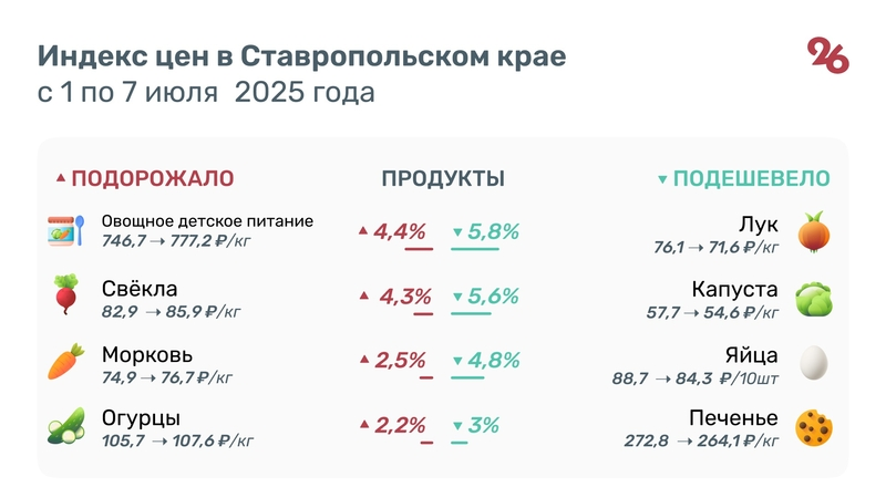 С 1 по 7 июля стоимость детского питания выросла на 4,4% — с 746,7 до 777,2 руб. за кг. Свёкла подорожала с 82,9 до 85,9 руб. за кг (+ 4,3%), морковь — с 74,9 до 76,7 руб. за кг (+2,5%), а огурцы — со 105,7 до 107,6 руб. за кг (+ 2,2%).