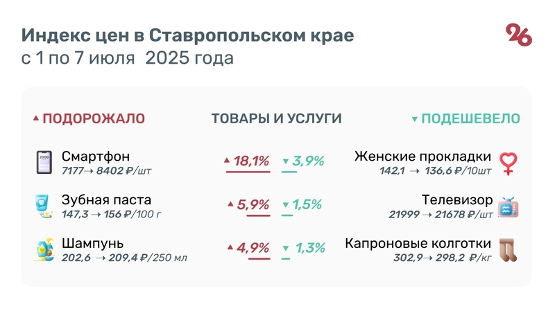Среди непродовольственных товаров и услуг на 18,1% выросла цена смартфонов — с 7177 до 8402 рублей. При этом телевизоры подешевели на 1,5% — с 21999 до 21678 рублей. Подробнее — в инфографике «Победы26».