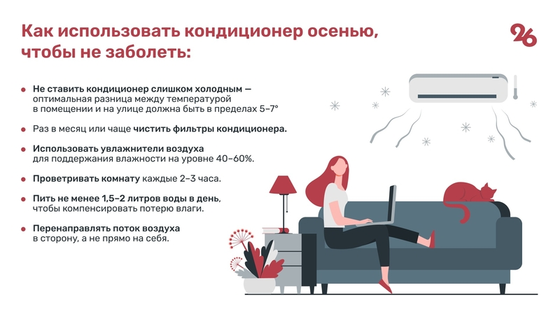 Однако кондиционер при неправильном использовании в начале осени может вызвать переохлаждение — особенно если сидеть под прямым потоком холодного воздуха, что приводит к простудам, обострению хронических заболеваний и мышечным болям.