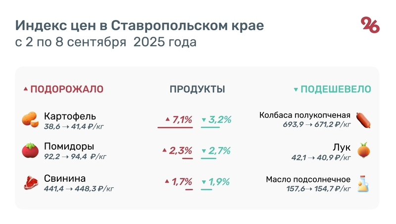 За неделю в Ставропольском крае подорожали картофель с 38,6 до 41,4 р/кг (+7,1%), помидоры с 92,2 до 94,4 р/кг (+2,3%) и свинина с 441,4 до 448,3 р/кг (+1,7%).