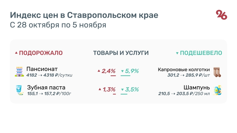 Среди непродовольственных товаров и услуг подешевели на Ставрополье капроновые колготки — с 301,2 до 285,9 рублей за штуку (-5,9%), и шампунь — с 210,5 до 203,5 рублей за 250 мл (-3,5%).