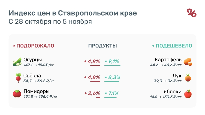 В то же время картофель подешевел с 44,6 до 40,6 руб/кг (-9,1%), лук — с 39,3 до 36 руб/кг (-8,3%), а яблоки — с 144 до 133,3 руб/кг (-7,1%).