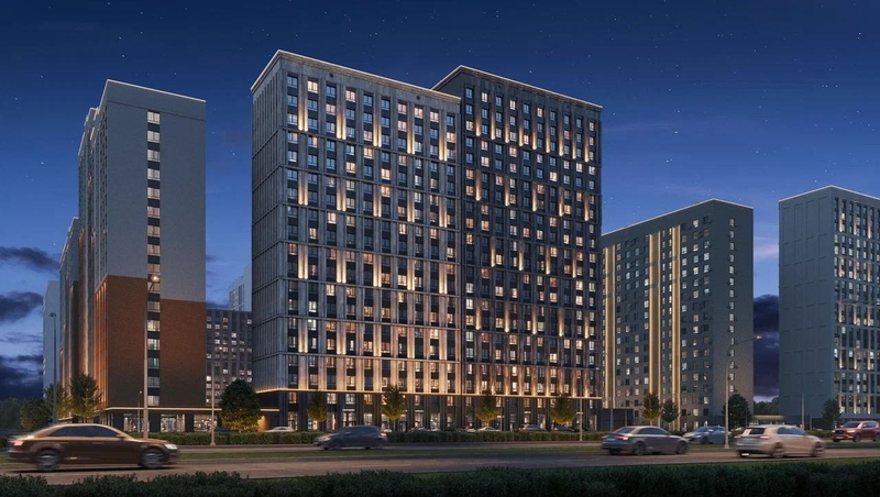 Каждый из новых корпусов демонстрирует индивидуальный архитектурный подход. В вечернее время подсветка подчёркивает геометрию зданий.