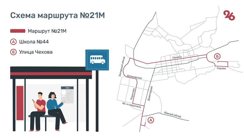 Маршрут № 21М будет следовать от остановки «Школа № 44» до «ул. Чехова» в Ставрополе. Его будут обслуживать десять единиц транспорта малого класса и десять — среднего класса. В среднем интервал между машинами будет составлять десять минут по расписанию в будние дни.