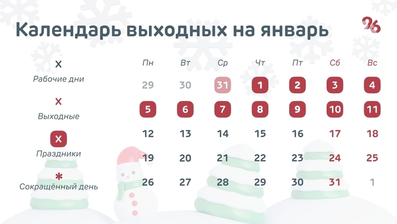 На следующей неделе — с 29 декабря по 4 января — ставропольцев ждёт два рабочих дня, а затем начнутся длинные январские выходные. Подробнее — в инфографике «Победы26».