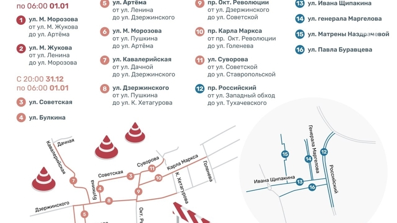 С 20:00 31 декабря до 6 часов 1 января проехать будет нельзя по улицам Артёма (от Ленина до Дзержинского), Морозова (от Пушкина до Артёма), Дзержинского (от Пушкина до К. Хетагурова), Советской, Булкина, Кавалерийской (от Дачной до Дзержинского), Суворова (от Советской до Ставропольской), проспектам К. Маркса (от Голенева до проспекта Октябрьской Революции), Октябрьской Революции (от Дзержинского до Советской), Российскому (от Западного обхода до Тухачевского), а также на улицах Ивана Щипакина, генерала Маргелова, Матрёны Наздрачёвой и Павла Буравцева.
