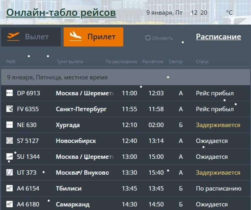 Судя по онлайн-табло, в аэропорту Ставрополя задерживается три рейса на прилёт. Два — из Москвы, один — из Санкт-Петербурга. При этом все рейсы на вылет, которые планировались с 11:50 до 16:00, переносятся на полчаса, три и пять часов.