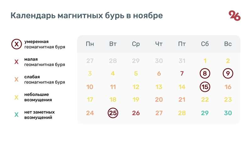 С 1 по 5 ноября на Ставрополье прогнозируют небольшие возмущения в геомагнитном поле. Затем они усилятся и достигнут пяти из восьми возможных баллов. Пик придётся на 8-9 числа.
