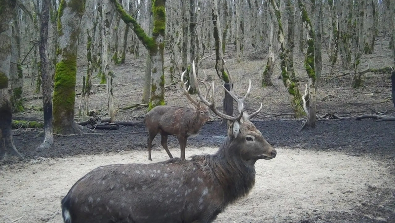 В объектив автоматической камеры попал взрослый самец. По данным экологов, общая численность пятнистых оленей на охраняемой территории превышает 200 особей, однако в естественной среде встретить осторожное животное с чутким слухом и обонянием практически невозможно.