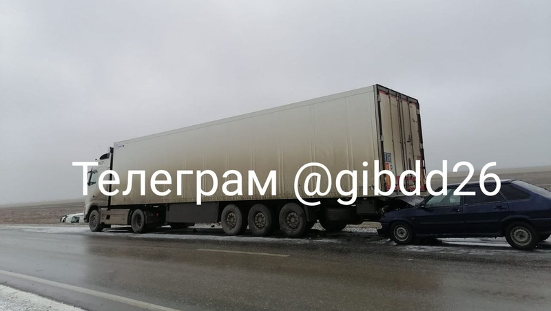 По предварительным данным, по трассе Кочубей — Нефтекумск — Зеленокумск — Минеральные Воды, спустя три минуты после съезда с дороги кроссовера Kia Sportage, произошло столкновение фуры Volvo и легковушки ВАЗ-2114, водитель которой не выдержал дистанцию.
