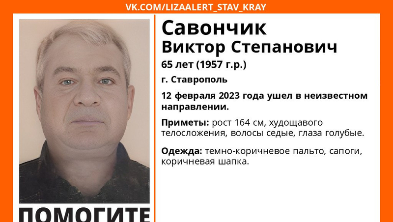 Виктор Савончик был одет в тёмно-коричневое пальто, сапоги и коричневую шапку. Всех, кому известно возможное местонахождение пенсионера или информация, которая может помочь в его поисках, просят обратиться по телефону: 8 (800) 700-54-52 или 112.