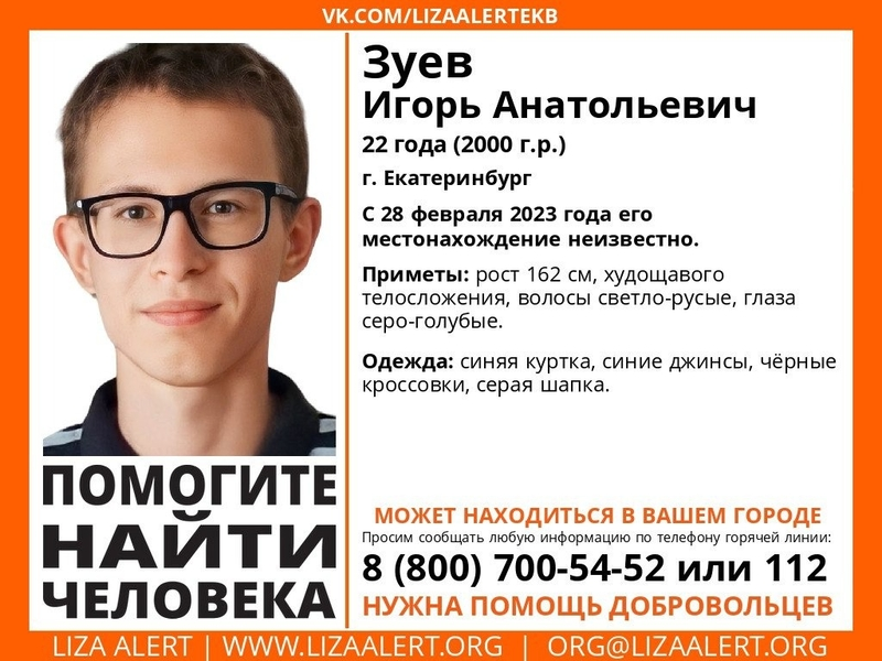 Игорь Зуев 2000 года рождения пропал в Екатеринбурге. При этом не исключается, что молодой человек может находиться на Ставрополье.