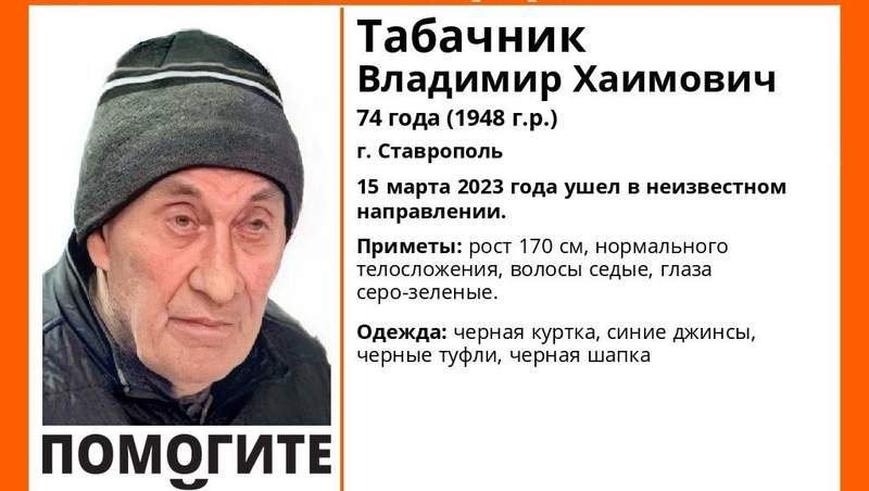 В среду, 15 марта, 74-летний житель столицы Ставропольского края Владимир Табачник ушёл из дома в неизвестном направлении и до сих пор не вернулся. Об этом сообщили координаторы поискового отряда «ЛизаАлерт» в регионе.