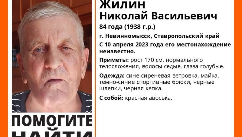 Волонтёры обращаются ко всем жителям края с просьбой помочь найти Жилина Николая Васильевича. Рост мужчины — 170 см, он нормального телосложения, с седыми волосами и голубыми глазами.
