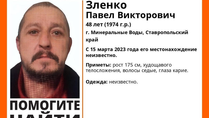 В Ставропольском крае идёт поиск Павла Зленко 1974 года рождения, место пребывания которого неизвестно с 12 марта 2023 года. На момент исчезновения 48-летний мужчина проживал в Минеральных Водах.
