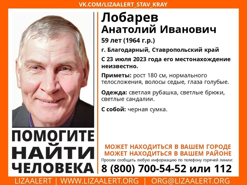 59-летний Анатолий Лобарев пропал 23 июля. Его приметы: нормальное телосложение, седые волосы, голубые глаза. Рост мужчины — 180 см. В день пропажи был одет в светлые рубашку и брюки, обут в светлые сандалии. С собой у мужчины была чёрная сумка.