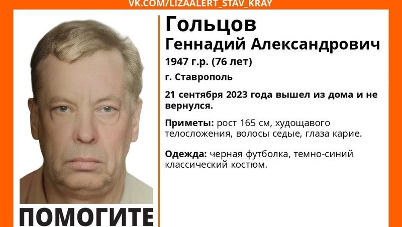 В день исчезновения пропавший был одет в чёрную футболку и темно-синий классический костюм.