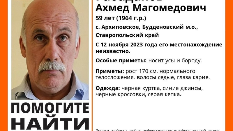 Местонахождение 59-летнего Ахмеда Рабаданова неизвестно его семье с 12 ноября. Он проживал в селе Архиповском.