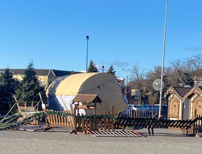 «К большому сожалению, сегодня из-за сильного ветра разрушилась резиденция Деда Мороза и Снегурочки на городской площади. Поэтому было принято решение прекратить её работу досрочно»,