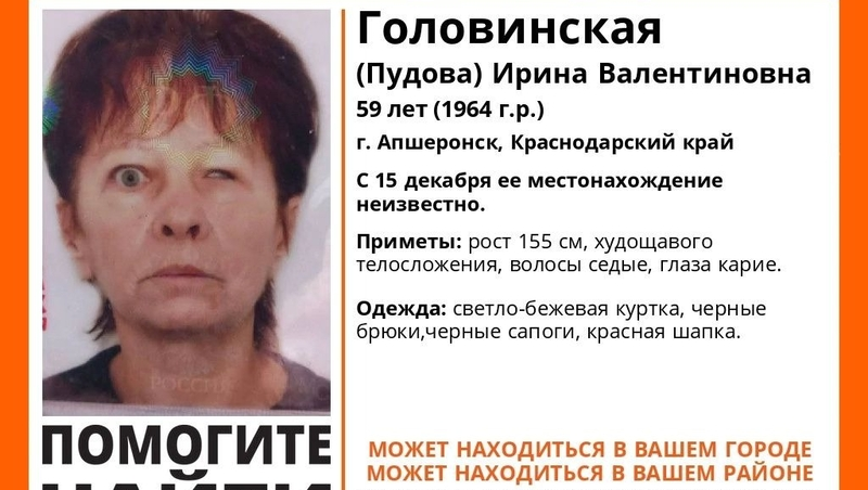 Ирина Головинская (Пудова) 1964 года рождения пропала в кубанском городе Апшеронск. С 15 декабря прошлого года её местонахождение неизвестно.