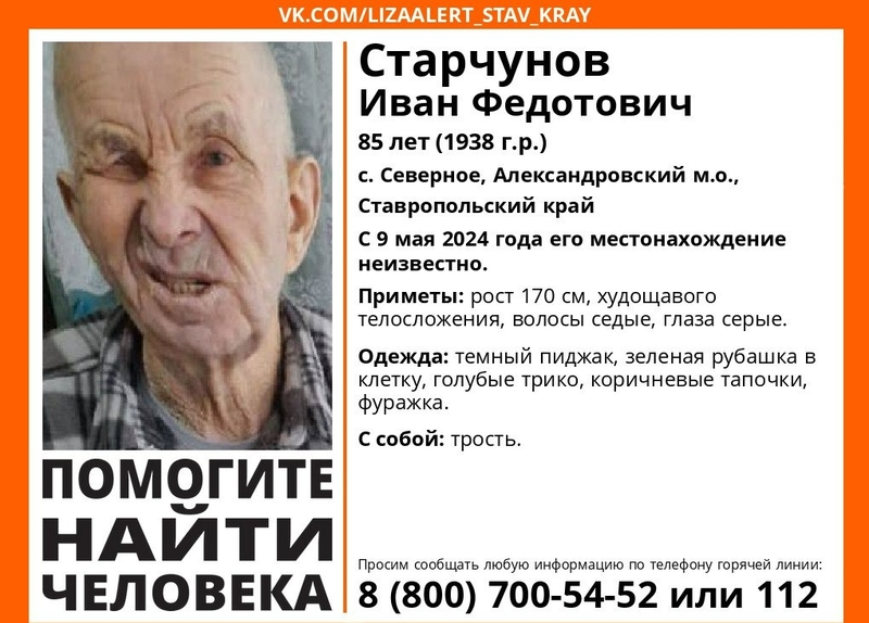 В день исчезновения был одет в тёмный пиджак, зелёную рубашку в клетку, голубое трико, коричневые тапочки и фуражку. Пенсионер ходит с тросточкой.