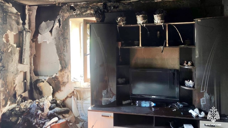Вчера днём в селе Краснокумском загорелся дом. Хозяйка жилища зашла в одну из комнат и увидела, что пламя охватило внутренний блок кондиционера. После попыток самостоятельно потушить возгорание она вызвала спасателей.