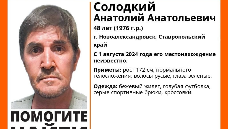Рост пропавшего Анатолия Солодкого — 172 см, он нормального телосложения, русоволосый, зеленоглазый. Одет был в бежевый жилет поверх голубой футболки, серые спортивные брюки и кроссовки.