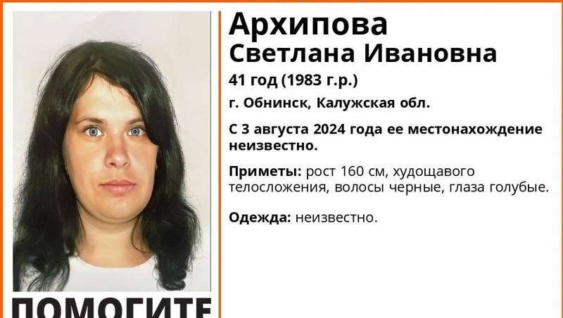 Светлане Ивановне 41 год. Из особы примет: рост — 160 см, чёрные волосы, голубые глаза, худощавое телосложение. Во что она была одета на момент пропажи — неизвестно. Все, у кого есть информация о её местонахождении, могут бесплатно с территории России позвонить на горячую линию 8 (800) 700-54-52.