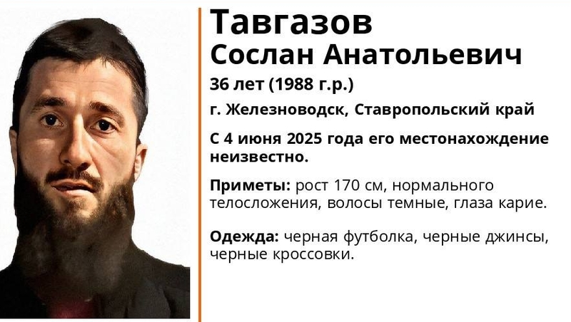 В момент исчезновения на Сослане были чёрные джинсы, чёрная майка и чёрные кроссовки.