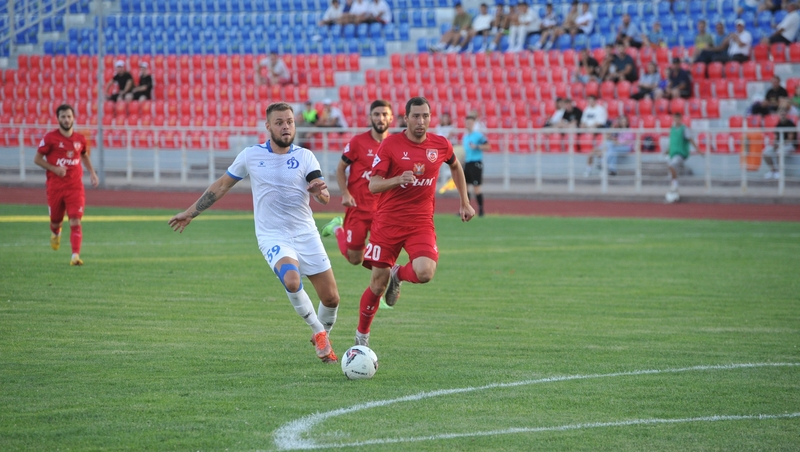К этой встрече бело-голубые подошли с печальными турнирными показателями: ноль побед, ноль голов, ноль очков. Сразу после стартового свистка динамовцы потеряли мяч на своей половине поля, за что мгновенно поплатились — навес с левого фланга нашёл голову Халима Юнусова, и он отправил мяч в ворота ставропольцев — 0:1.