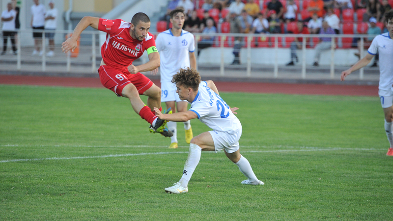Динамовцы чаще тревожили голкипера нальчан Асланбека Кумыкова, но и его коллега на другой половине поля Владислав Лизенко без работы не оставался. Запомнились две попытки открыть счёт от капитана «гладиаторов» Алана Хачирова, однако в обоих случаях страж динамовских ворот оказался на высоте – в прямом и переносном смысле этого слова. У бело-голубых цель могли поразить Артём Исик, Марат Кучиев и Лука Багателия, но до перерыва на табло остались гореть унылые ноли.