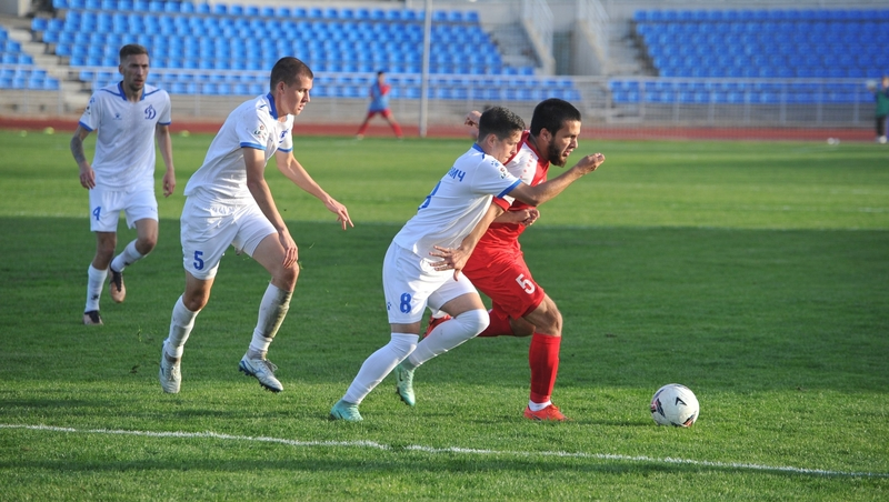 По традиции последних матчей «Динамо» в дебюте встречи случился быстрый гол: бело-голубые допустили ошибку в обороне, чем тут же успешно воспользовался Залимхан Майсултанов — лучший бомбардир «Победы» и подгруппы 1 «Б».
