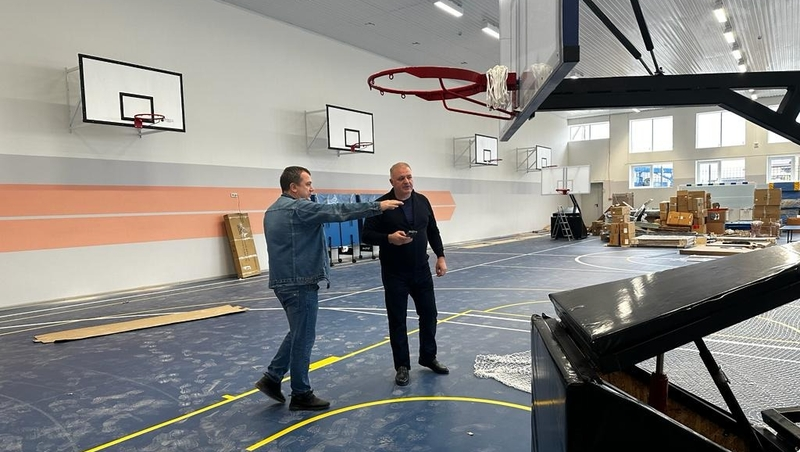 В здание уже завезли оборудование и мебель, сейчас их устанавливают на местах. В пищеблоке разместили и подготовили холодильники и варочные плиты, а в спортзале продолжается сборка инвентаря. На прилегающей территории идёт благоустройство.
