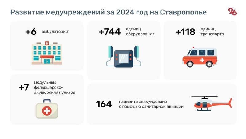 В четверг, 22 мая, состоялось ежегодное послание губернатора Ставрополья Владимира Владимирова. Одна из тем была посвящена развитию здравоохранения. Глава региона отчитался, что за 2024 год в крае открыли шесть амбулаторий, построили семь ФАПов, капитально отремонтировали 47 объектов. Помимо этого, специалисты установили 744 единицы медицинского оборудования и закупили 118 единиц транспорта. Это в три раза больше, чем в 2023 году. Также при помощи санавиации эвакуировано 164 пациента.