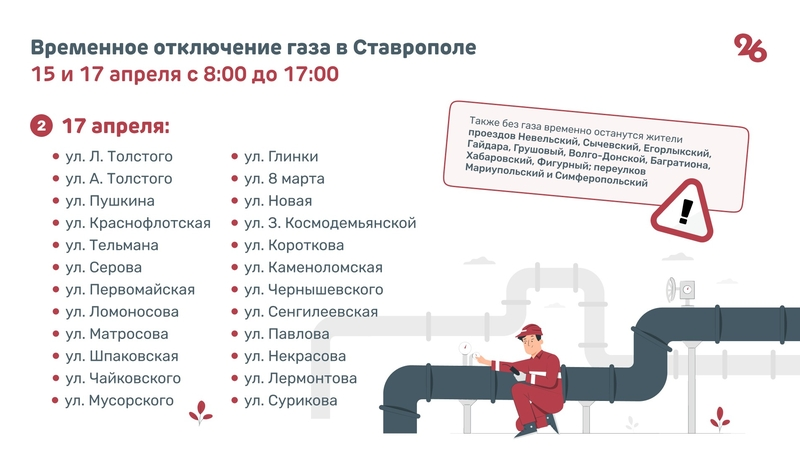 В следующий четверг, 17 апреля, без газа останутся абоненты на улицах Л. Толстого, А. Толстого, Пушкина, Краснофлотской, Тельмана, Серова, Первомайской, Ломоносова, Матросова, Пушкина, Шпаковской и других.