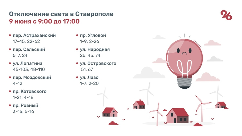 Из-за плановых ремонтных работ 9 июня с 9:00 отключили электричество по переулкам Астраханскому, Сальскому, Моздокскому, проспектам Котовскому, Ровному, Угловому и улицам, Лопатина, Народной, Островского, Лазо. Ресурс вернут в 17:00.