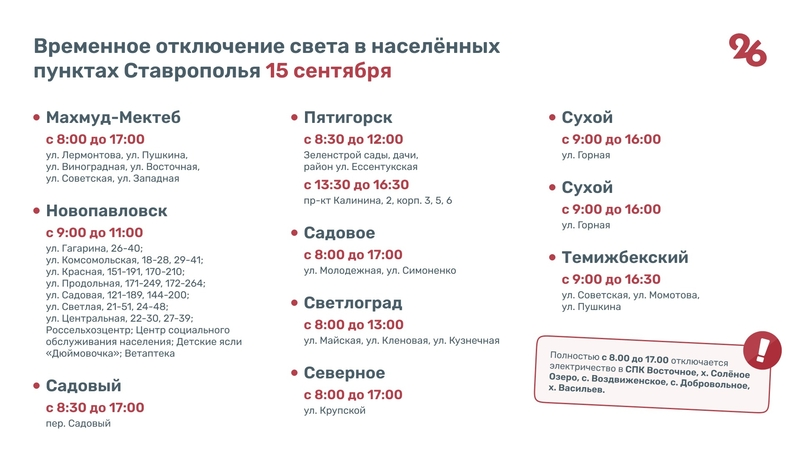 Электроэнергию отключат в Александровском, Георгиевске, Зеленокумске, Кочубеевском, Минводах, Пятигорске, Светлограде и других территориях региона. Полные список представлен в инфографике.